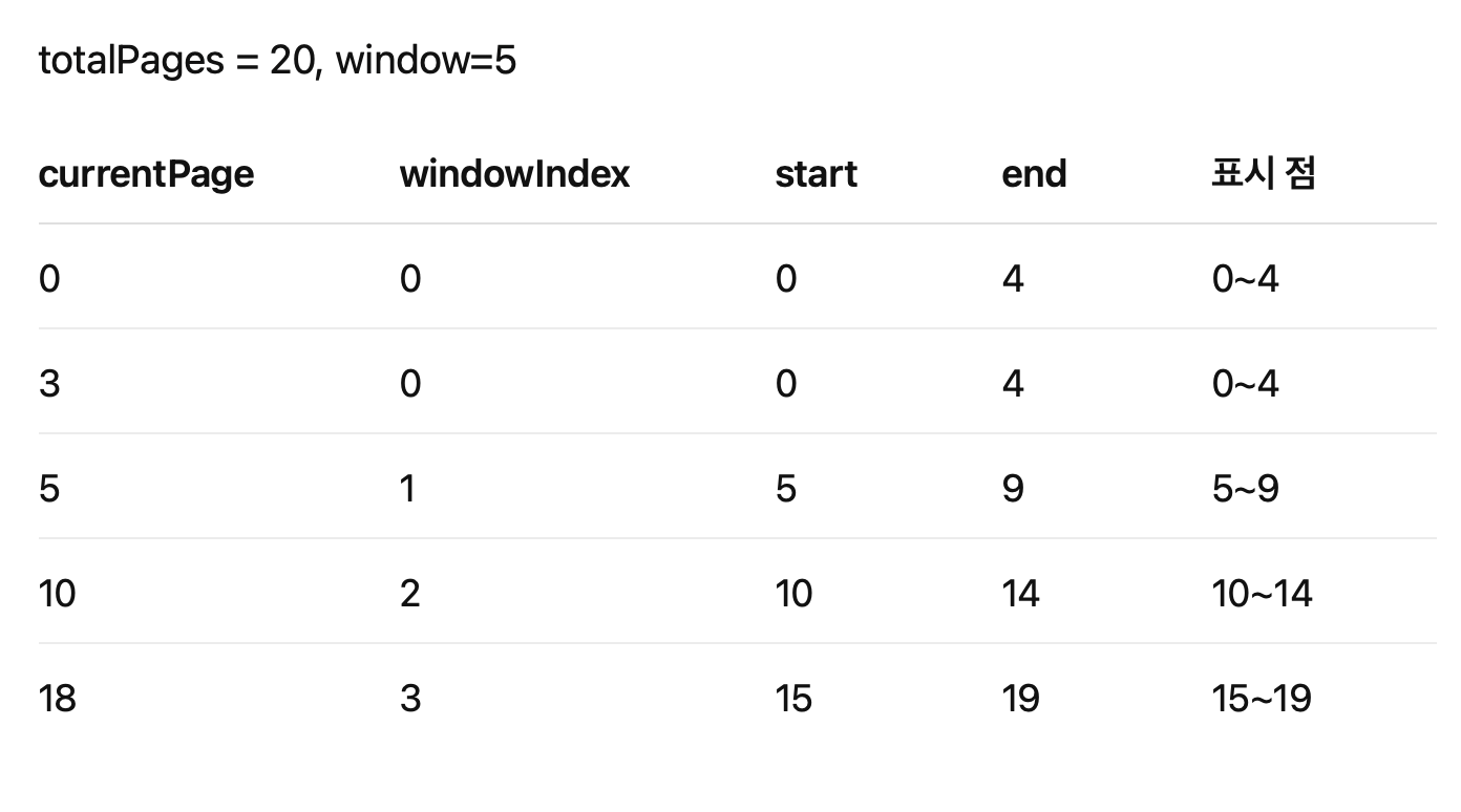 초기 구현은 단순하게 현재 페이지 기준으로 start/end 계산 후 점 배열을 만들고,