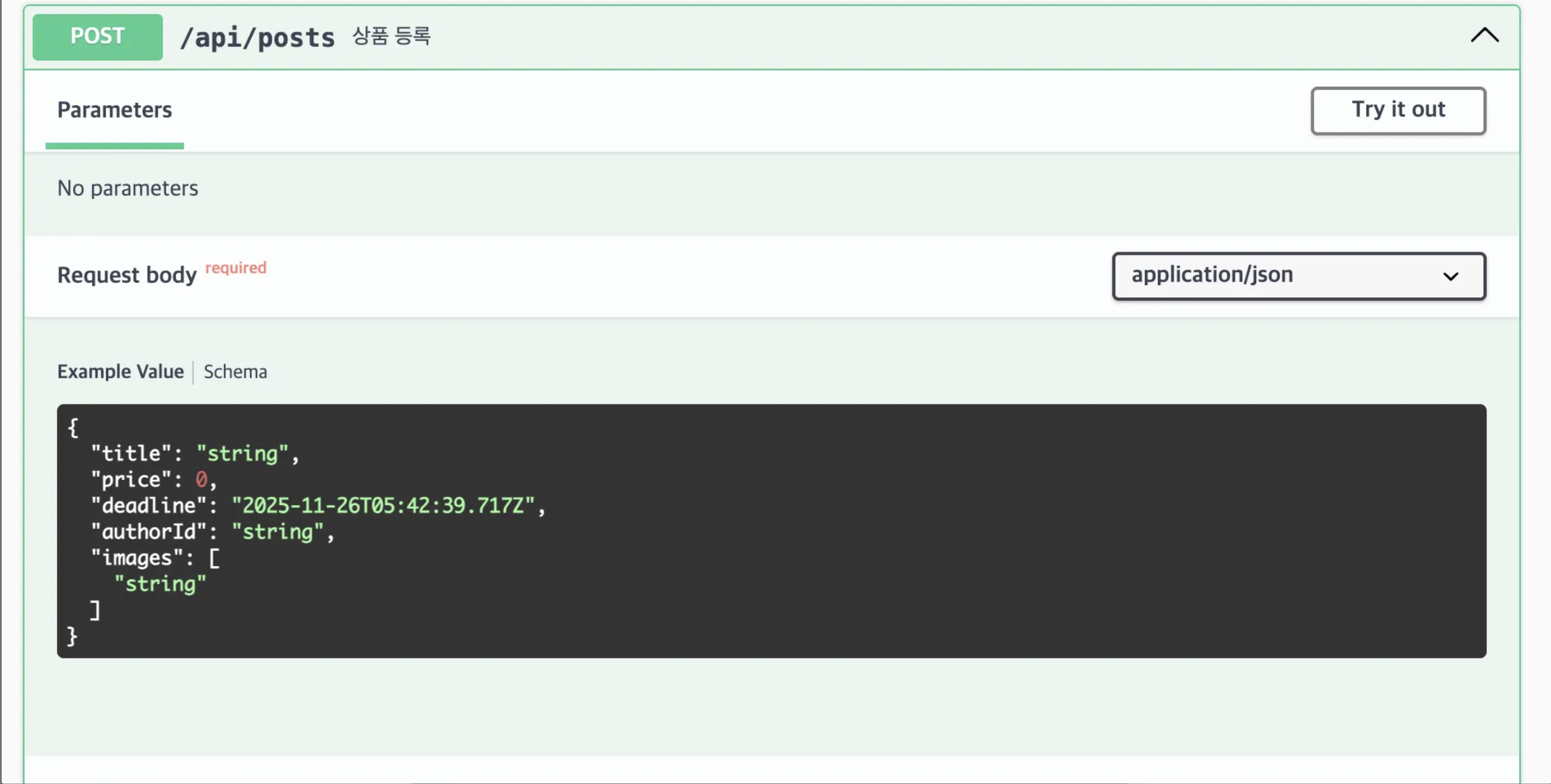 현재는 title, price, deadline, authorId, Images 라는 속성을 필수적으로 사용자에게 요구하고 있습니다.
