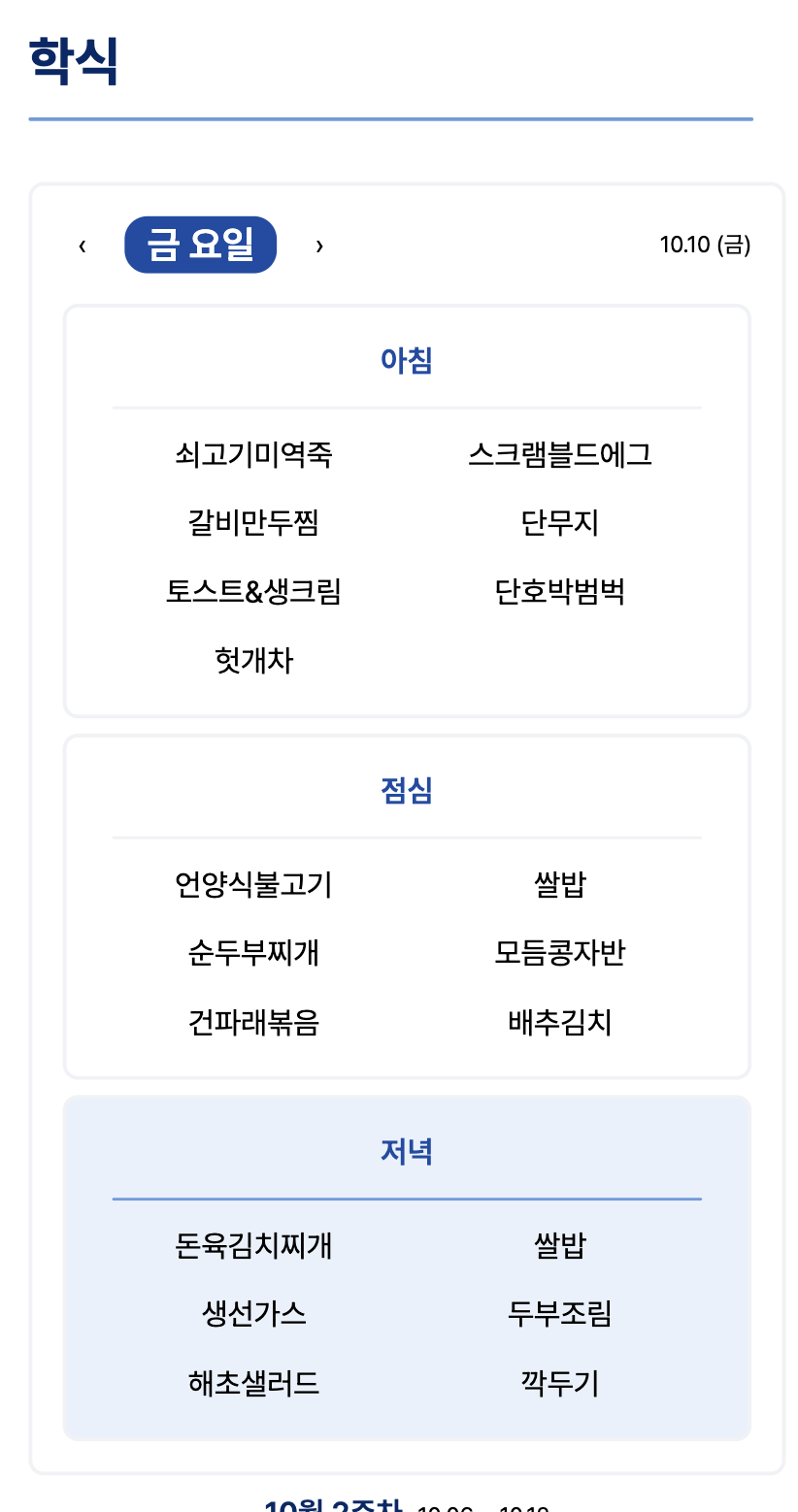 증상 (Symptom)onPrev/onNext 눌렀을 때 (화살표) 이전, 다음 요일로 넘어갔어야했다.그런데 UI(식단 내용) 갱신 X즉, 부모에서 idx는 바뀌지만 자식이 받는 첫 props가 “유효 데이터”가 아님정리하면 API에서 데이터를 받아오면 나의 컴포넌트는 이런 순서로 동작했다. useMenuData()가 처음 렌더될 때는→ idx도 초깃값(null 또는 0)아직 keys와 todayKey가 빈 상태([], '')React가 렌더를 수행 →빈 배열([]) 반환 → 자식 컴포넌트는 “메뉴 없음”만 보임.getByDate(dateKey)는 아직 유효한 키를 못 찾음 그 후 react-query가 API 응답을 받고 keys 갱신 →이때 제대로 “한 번만” todayKey에 맞춰야 정상 작동.us..